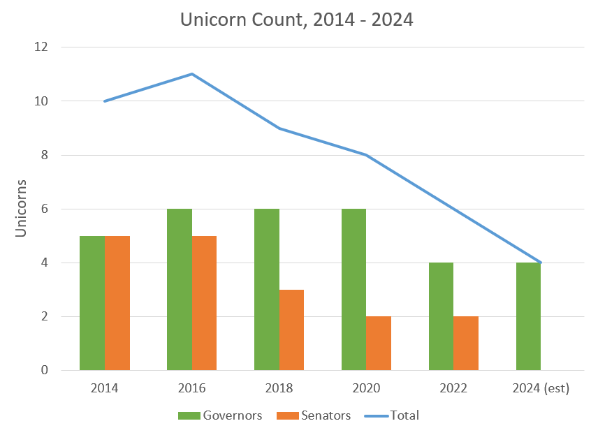 Back in 2018, I started tracking political “unicorns” – governors and U.S. Senators who won elections despite the state being strongly in favor of the other party. Here’s an updated chart that shows how the number of unicorns has changed over the last 10 years: