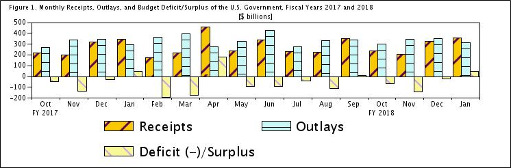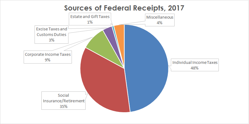 That leaves corporate income taxes, which are more complicated. The top corporate tax rate was slashed from 35% to 21%; that lower rate will tend to push down receipts, but any increased profits (from lower tax bills, and longer-term from investments in equipment or people) will increase receipts. But here’s the tricky part: the tax law also significantly reduced the tax rate for “repatriating” overseas profits (converting them to dollars and paying taxes on them), dropping it from 35% to either 15.5% or 8%, depending on whether it’s cash or other assets. It’s estimated that more than $2.6 trillion in corporate profits has been sitting overseas; many companies have been waiting for a tax break to bring them home, rather than repatriating on an annual basis. Overall corporate income taxes normally make up only 9% of overall receipts (I was surprised with how low this number was), under $300B per year. Apple, Citigroup, Goldman Sachs, Bank of America, American Express, and JP Morgan Chase have already announced their intention to pay over $70B in one-time repatriation taxes, and the overall increase from this policy is expected to top $300B. So this repatriation will be a significant portion of overall corporate tax receipts.