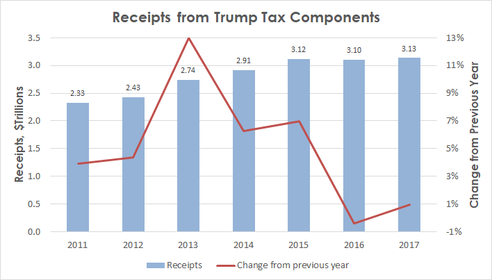- Estate and Gift Taxes: The new law doubled the tax-free threshold for estate taxes from $5.7M to $11.4M, which will decrease receipts.